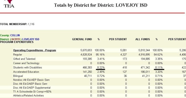 Lovejoy ISD spent incrementally less every year on the children who need the most help, until the 2006-2007 year. These charts were posted school year 2006-2007 and may have affected budgeted spending for year 2006-2007. This would be the first year that the spending percentage for learning difference children increased rather than declined. The increase in budgeted spending may also be a result of children returning from Allen ISD (grades 7th & 8th) where their learning differences may have been identified in Allen ISD and were not identified in elementary at Lovejoy ISD. According to information from the TEA, Lovejoy still spends less on children with learning differences than all other Collin County districts.